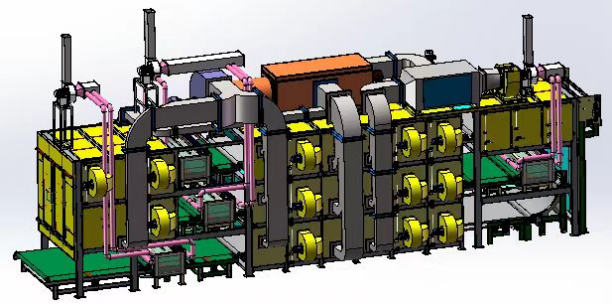 烘干設(shè)備有四個(gè)噴嘴機(jī)構(gòu),對(duì)材料進(jìn)行噴涂,噴涂后進(jìn)入烘干室。烘干室采用天然氣燃燒機(jī)加熱。風(fēng)場(chǎng)穩(wěn)定、熱均勻性良好。